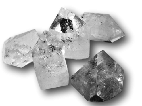 Apophyllit ähnelt sehr dem Bergkristall. Als markantes Erkennungszeichen sind seine pyramidenförmigen Spitzen nur 4-flächig ausgebildet und er zeigt flache Bruchflächen. Bergkristallspitzen hingegen laufen immer 6-flächig zusammen und die Bruchflächen sind muschelig ausgebildet.
