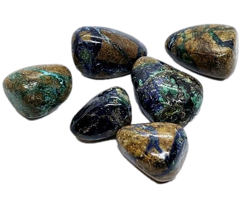 Azurit-Malachit wird oft stabilisiert angeboten. Das Mineral wird dazu in Epoxidharz getränkt, um eine glattere Oberfläche zu erhalten. Dabei handelt es sich um geschönte, bzw. gefälschte Steine, deren heilkundliche Wirkung angezweifelt werden muss.