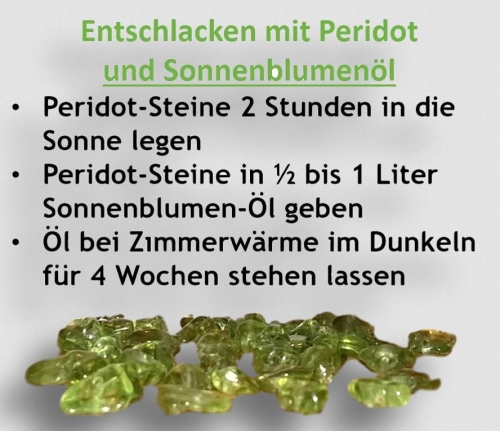 Peridot entgiftet stark und nachhaltig. Peridot regt den Stoffwechsel von Leber und Galle an; beschleunigt Heilungsprozesse; hilft gegen Pilze (Candida) und Schuppenflechte; lindert gallenbedingte Verdauungsbeschwerden, mindert die Bildung von Gallensteinen; unterstützt die Nebennieren. Seelisch/geistig löst Peridot Trauer, Neid, aufgestaute Wut, Selbstvorwürfe und Schuldgefühle; hilft gegen Angst vor Einsamkeit, und Dunkelheit sowie gegen das Gefühl, abgespalten, entwurzelt, verwünscht oder Opfer zu sein; fördert Lernvermögen und Selbstbestimmung. Die beste Wirkung zeigt Peridot wenn der Stein in Sonnenblumenöl eingelegt wird (Rezept siehe Datenblatt)