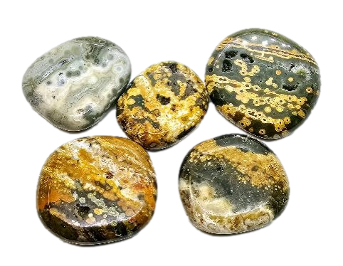 Ozeanchalcedon (auch sphärolithischer Chalcedon) ist zusammen mit Heliotrop der wichtigste Immunitätsstein. Er ist ein weiser und sanfter König der Heilsteine. Bis anhin nur in Madagaskar gefunden, verkörpert er unzählige Eigenschaften. Dies ist auf seine Signatur und die verschiedenen Farben – von grün über weiss, bis gelb, rötlich und braun – zurückzuführen, die mit ihren entsprechenden Schwingungen auf unsere Organe einwirken. Kein anderer Heilstein kommt in seiner Signatur unserem Zellenaufbau so nahe. Die weissen Flecken gleichen Lymphozyten und fördern damit die Körper-Abwehr.